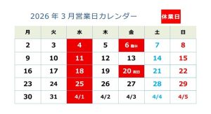 2026年3月の定休日をご案内させていただきます。